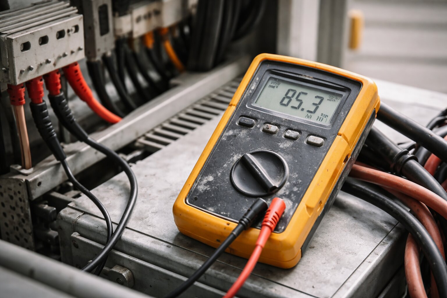 Pomiar rezystancji izolacji w rozdzielni elektrycznej z miernikiem i przewodami pomiarowymi w technicznym ujęciu
